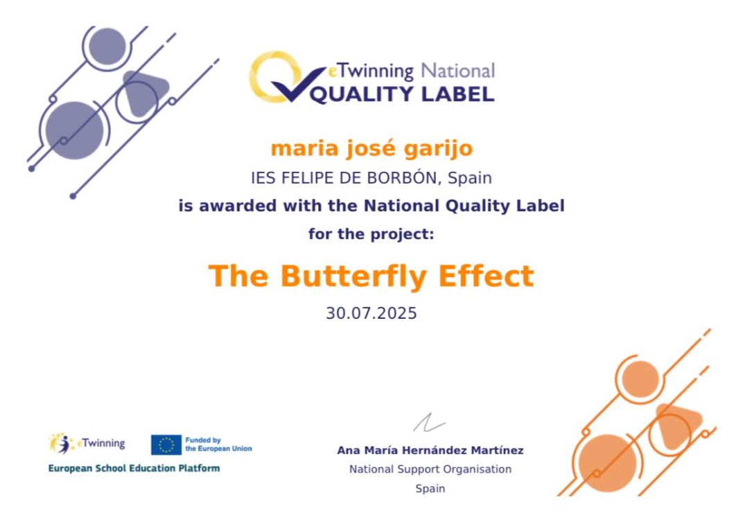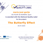 Cerramos el mes de julio recibiendo dos sellos de calidad por el proyecto «The Butterfly Effect», tanto al propio proyecto como a la coordinadora, nuestra profesora Mª José Garijo. Enhorabuena por este logro.