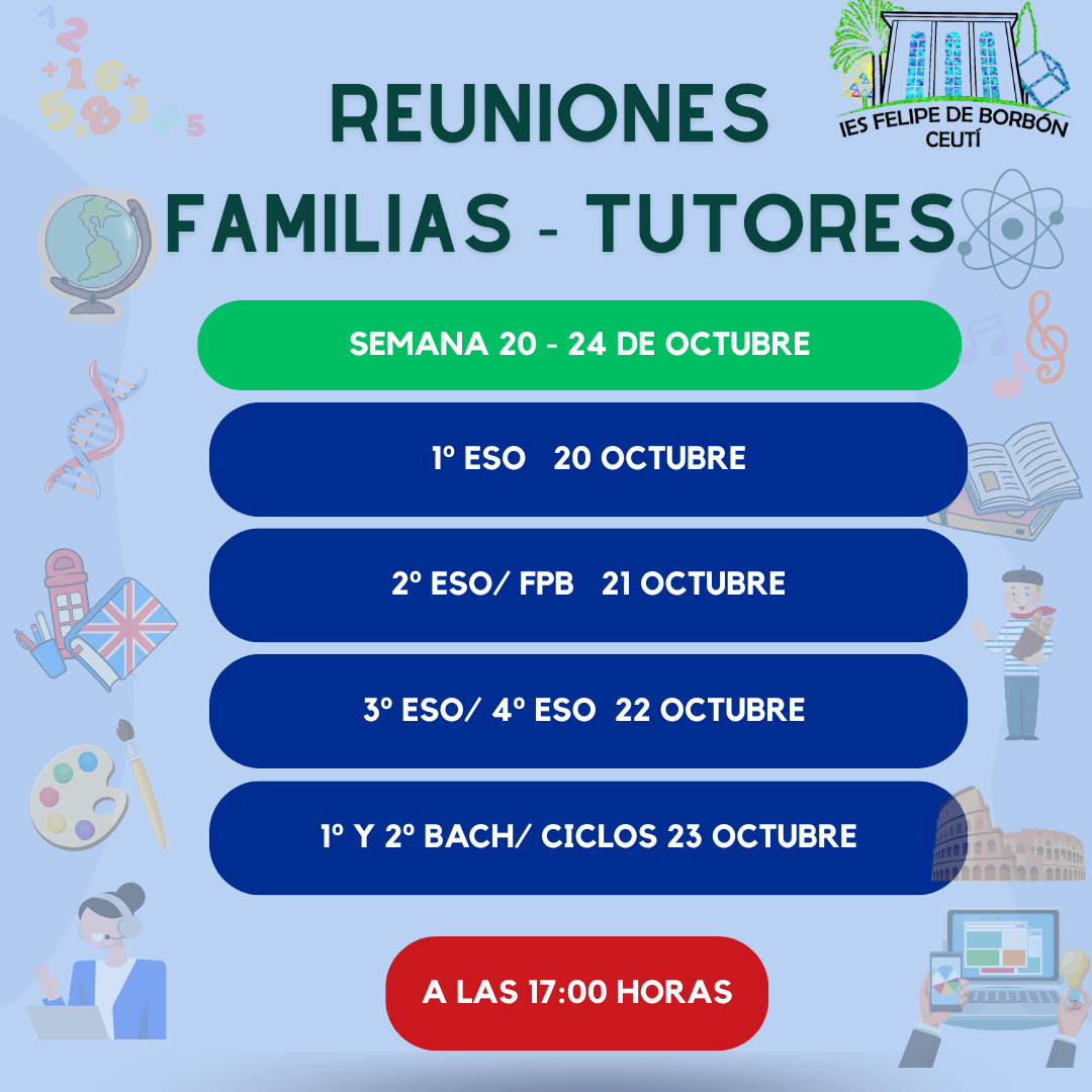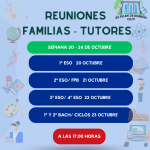 Les informamos que las reuniones iniciales de tutores con las familias se celebrarán la semana del 20 de octubre. El objetivo de estas reuniones es presentar el curso escolar, dar a conocer las normas de convivencia y organización del centro, así como facilitar un primer encuentro entre tutores y familias para fortalecer la colaboración.
