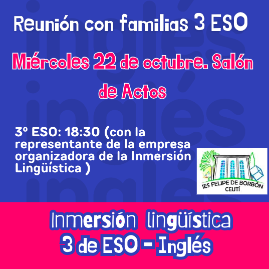 Se convoca a las familias de 3º de ESO a una reunión informativa con la representante de la empresa organizadora de la Inmersión Lingüística el próximo miércoles 22 de Octubre a las 18.30 en el salón de actos del centro.