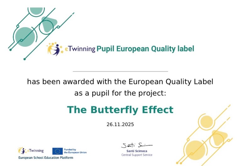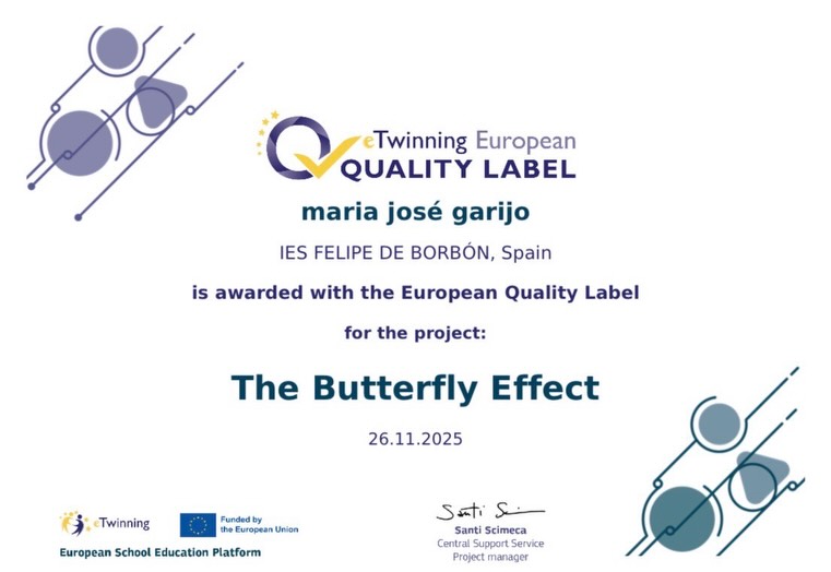 Nuestro proyecto eTwinning “The Butterfly Effect”, que ya obtuvo el Sello de Calidad el curso pasado, ¡ha sido ahora reconocido también a nivel europeo! 🌍🏆
