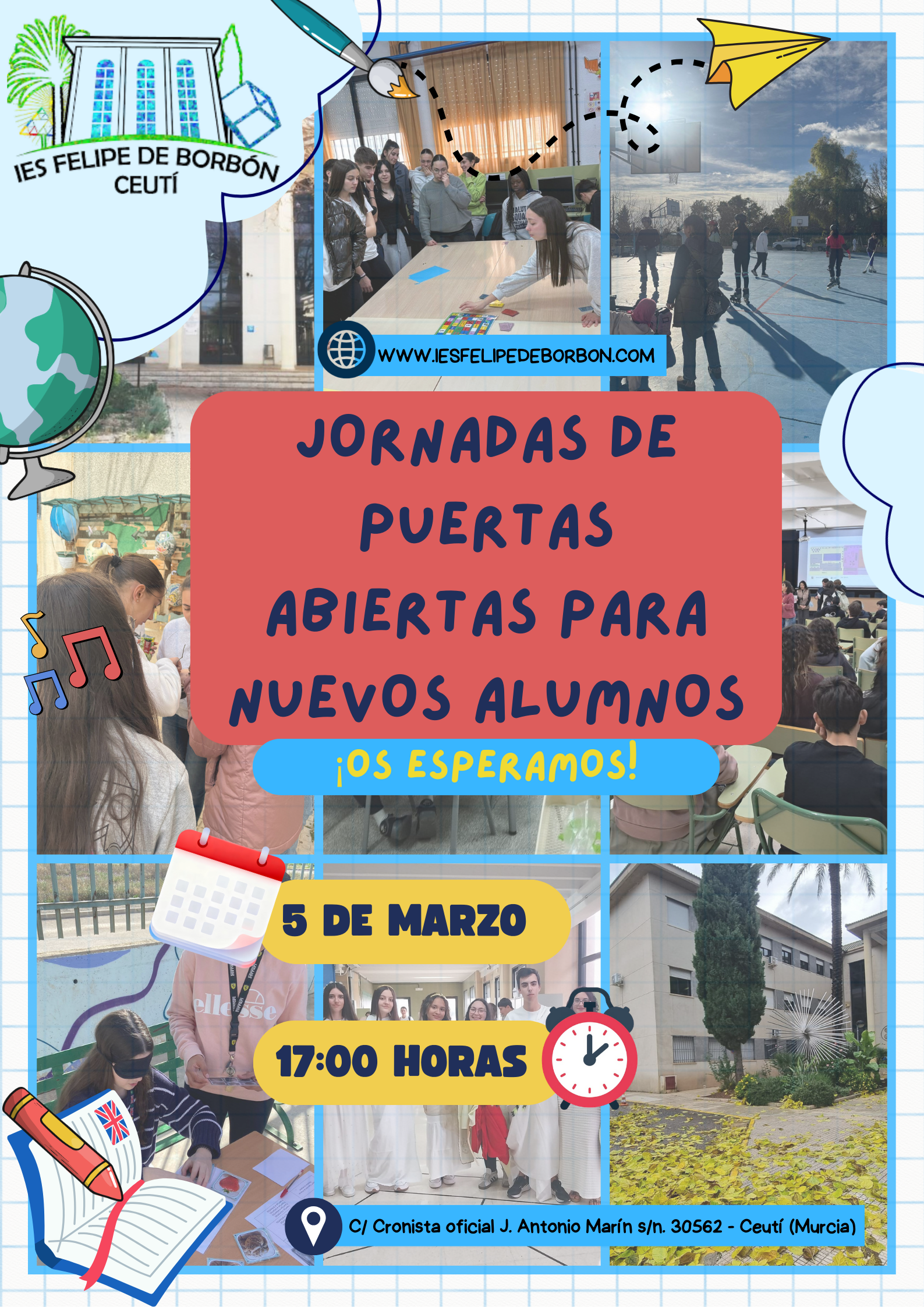 Desde el IES Felipe de Borbón de Ceutí, nos complace invitar a todas las familias y futuros alumnos a conocer nuestras instalaciones y nuestra oferta educativa para el próximo curso.